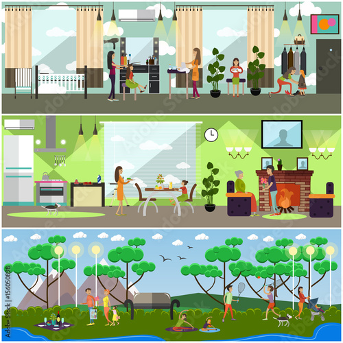 Векторный набор плакатов или баннеров с интерьером ресторана, гостиной и улицы, где счастливые влюбленные пары встречаются, встречаются и гуляют вместе. Дизайн в плоском стиле.
