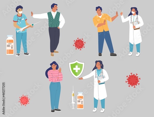 Пациенты, персонажи мужского и женского пола, показывающие знак остановки врачу со шприцем, плоская векторная иллюстрация. Люди, борющиеся с вакциной, отказываются от инъекции вакцины против covid-19. Нерешительность в отношении вакцины. Анти-вакс.