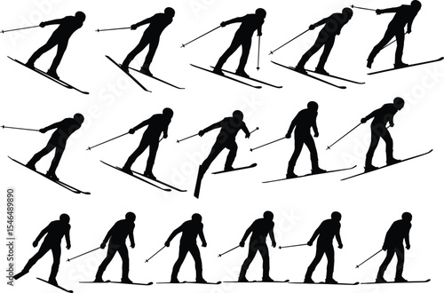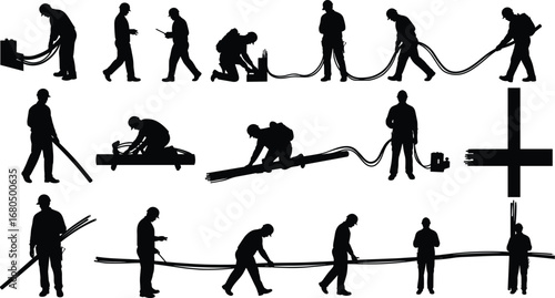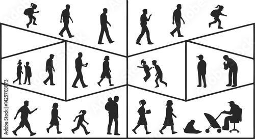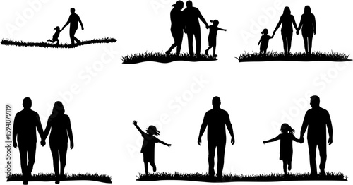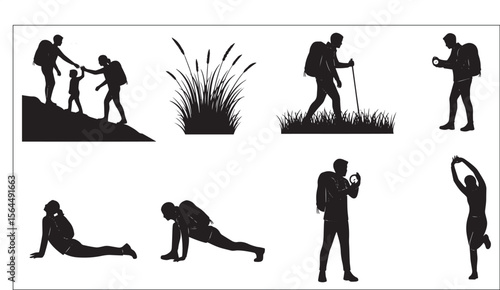 Персонажи активных людей в развлекательном комплексе rope park - черно-белый силуэт, изолированный набор. Дети, родители и малыши, взрослая пара, маленькие друзья, развлекающиеся аттракционом, приключенческая векторная иллюстрация на открытом воздухе