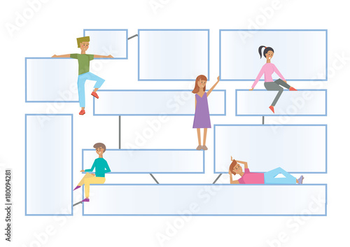 Люди, покупающие билеты в кино в терминале самообслуживания и в кассе кинотеатра, стоящие в очереди, плоская векторная иллюстрация. Касса кинотеатра против киоска самообслуживания. Индустрия развлечений.
