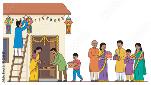 Люди горожане готовятся к празднованию Рождества и Нового года векторная иллюстрация. Мужчина и женщина держат рождественскую елку, подарочную коробку, различные покупки, прогуливаясь по заснеженной уличной сцене