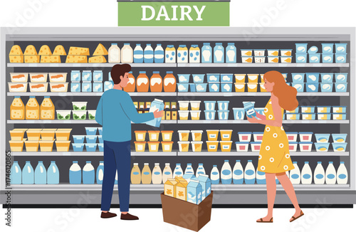 Люди моют пол в магазине, пока покупатели делают покупки. Векторная иллюстрация в плоском ретро-стиле. Услуги по уходу за полом и уборке в магазине супермаркета.