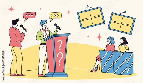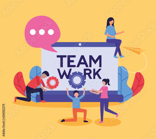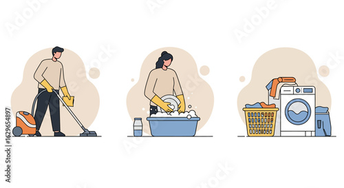 Крошечные персонажи мужского и женского пола моют пол пылесосом, шваброй, предупреждающий знак мокрого пола, плоская векторная иллюстрация. Коммерческие услуги по уборке.