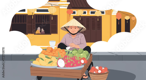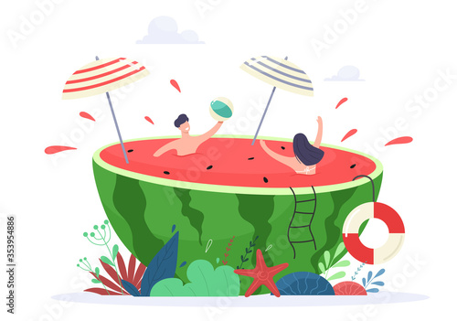 Люди готовят вкусный десерт, клубничное варенье ручной работы в большой кастрюле, плоская векторная иллюстрация. Приготовление фруктового джема, производство.