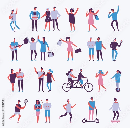 Набор векторных иллюстраций с красочными силуэтами людей, занимающихся ремеслами и активными увлечениями. Мужчина и женщина танцуют цветные фигуры, рыбачат, рисуют, лепят, готовят еду, музицируют, наслаждаются игрой в гольф