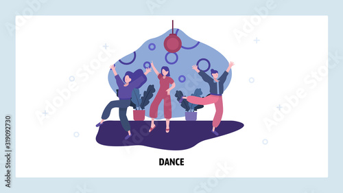 Люди танцуют на домашней вечеринке. Молодые счастливые девушки празднуют и танцуют. Векторный шаблон дизайна веб-сайта. Иллюстрация концепции сайта целевой страницы.