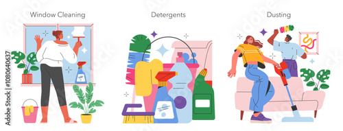 Люди, выполняющие домашнюю работу и убирающиеся в доме. Векторный набор плакатов с мужчиной, пылесосящим пол, и женщиной, моющей посуду и моющей окно. Домашний интерьер, робот-пылесос, люди, занятые уборкой домашнего хозяйства.
