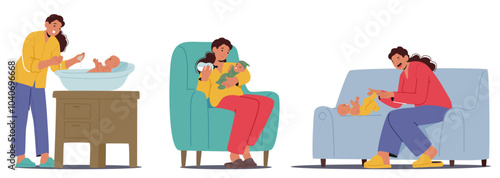 Люди, мечтающие о наборе сцен, плоская векторная изолированная иллюстрация. Мечтательные мультяшные персонажи мужского и женского пола, думающие о чем-то, отдыхая дома, гуляя с собакой, работая на компьютере.