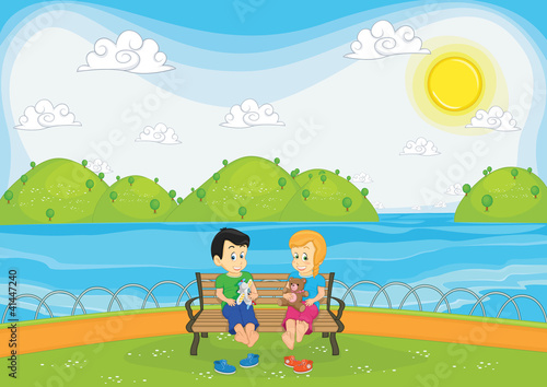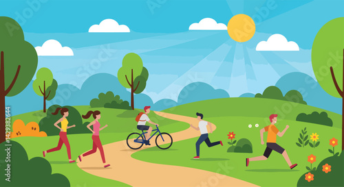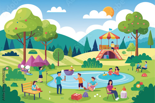 Люди, занимающиеся рыбалкой на берегу реки, мультяшная векторная иллюстрация. Рыбак с удочкой над природным ландшафтом. Концепция выходных на свежем воздухе и мужского досуга
