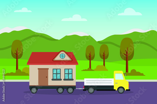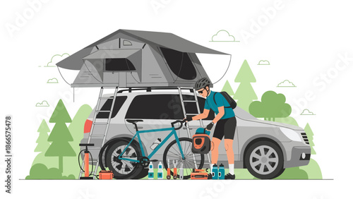 Люди, наслаждающиеся автомобильным кемпингом и дорожной поездкой, набор плоских векторных иллюстраций. Счастливые пары, путешествующие на машине, трейлере-кемпере, кабриолете и велосипеде. Летние каникулы, автомобиль для путешествий.