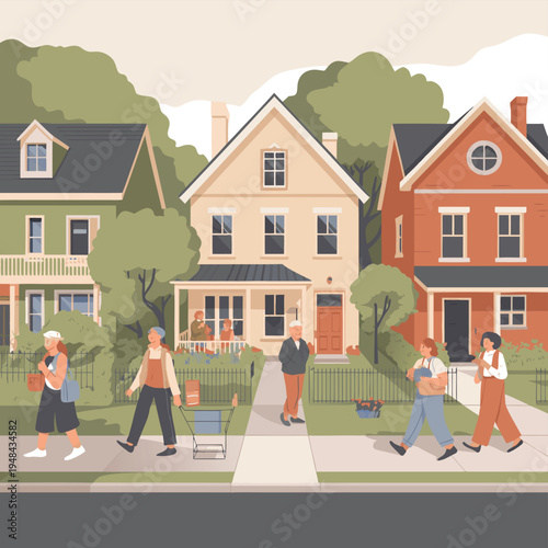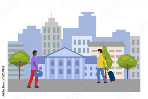 Счастливые люди гуляют, бегают, занимаются йогой, сидят на скамейке, читают книгу в городском парке, плоская векторная иллюстрация. Персонажи наслаждаются весенней погодой. Здоровый активный образ жизни. Весенний досуг.
