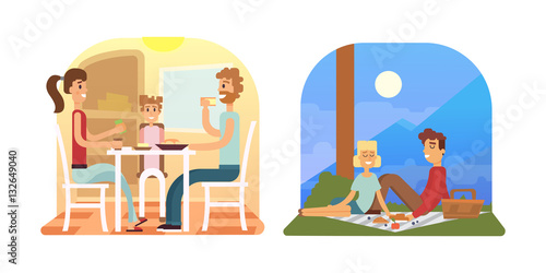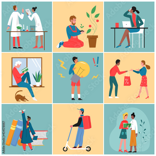 Люди, наслаждающиеся своими хобби векторная плоская иллюстрация. Цветоводство, кулинария, конструирование моделей или изготовление макетов самолетов и кораблей.