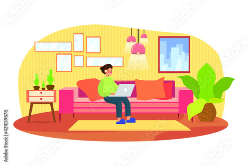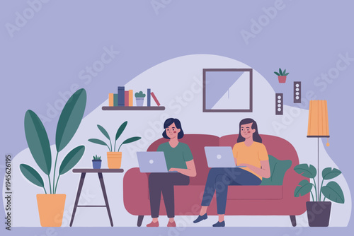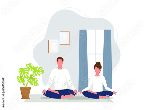 Люди упражняются дома набор векторных иллюстраций. Мужчина и женщина занимаются фитнесом, растяжкой и йогой. Семейная тренировка и здоровый образ жизни. Оставайтесь в форме во время блокировки. Спорт дома мультфильм.