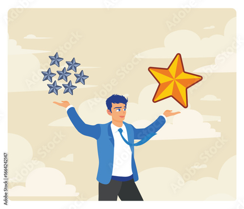 Люди, дающие пятизвездочный отзыв, показывающие жесты "ок", "да", оставляющие положительный отзыв, плоская векторная иллюстрация. Опрос удовлетворенности клиентов. Рейтинг пять звезд.