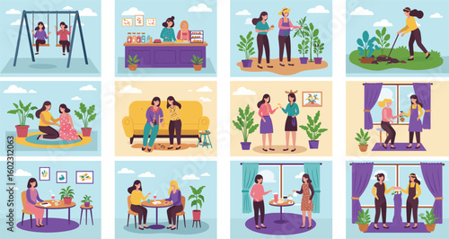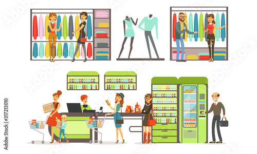 Набор векторных плакатов "Люди в автобусе". Интерьер городского общественного транспорта, сидящие и стоящие пассажиры. Люди добираются на работу на автобусе.