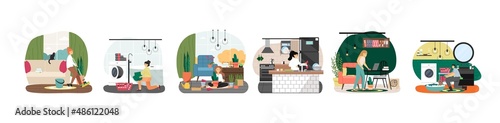 Люди в кафе работают и пьют кофе, концепция векторной иллюстрации. Клиенты покупают кофе в кафе-магазине. Официант приносит кофе и пирожное клиентке.
