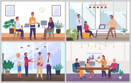 Люди в офисе сидят за столами и разговаривают друг с другом. Векторные плакаты концепции делового офиса. Заседание правления компании и финансовая презентация. Командная работа, кофеварка рядом с офисным холодильником.