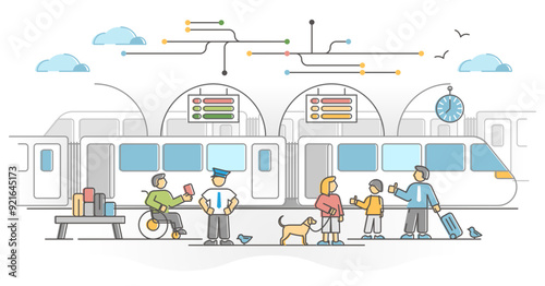 Люди в инвалидных колясках, свободно передвигающиеся по городским общественным местам и транспорту, доступному для инвалидов, плоская векторная иллюстрация. Безбарьерная среда.