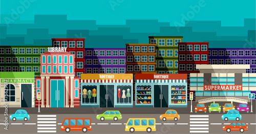 Векторная иллюстрация интерьера продуктового магазина с женщиной-кассиром и матерью покупателей со своим ребенком и мужчиной, оплачивающим покупки кредитной картой. Концепция людей, совершающих покупки. Дизайн в плоском стиле.