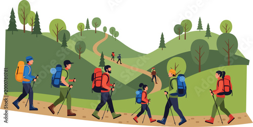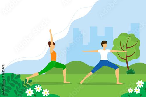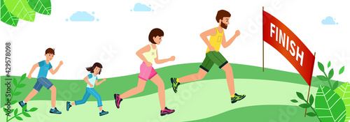 Люди разного возраста бегают в природном городском парке во время утренней векторной иллюстрации. Молодые, взрослые, пожилые мужчины и женщины занимаются кардиотренировкой, бегают трусцой, наслаждаясь здоровым образом жизни