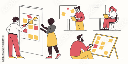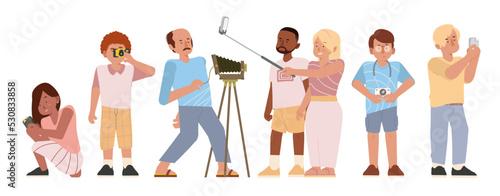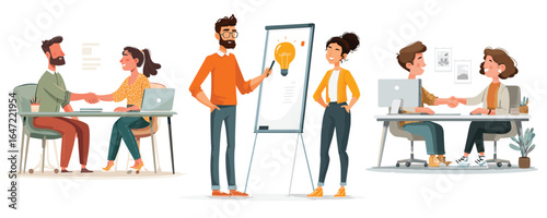 Мультяшные люди, открывающие двери, входящие, выходящие из набора векторных сцен. мужчина и женщина разного возраста на иллюстрации дверных проемов и подъездов. Персонажи проходят через входы в дома и офисы