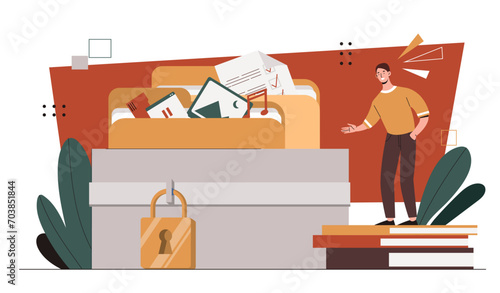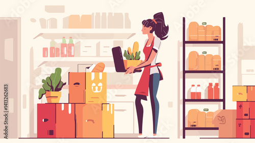 Люди упаковывают картонную коробку с домашними вещами. Набор векторных плакатов службы переезда дома. Мужчина несет картонную коробку к грузовику. Женщина упаковывает книги в картонную коробку.