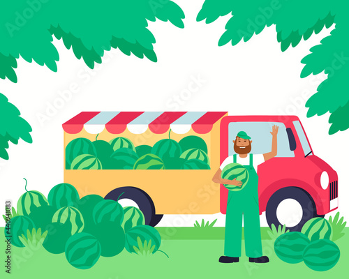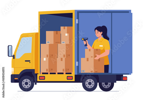Люди собирают яблоки в саду и загружают ящики с фруктами в грузовик для транспортировки, плоская векторная иллюстрация. Сбор фруктов, садоводство, сельское хозяйство.