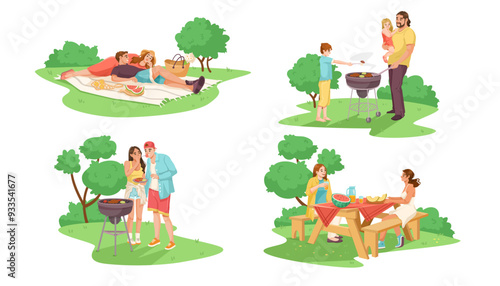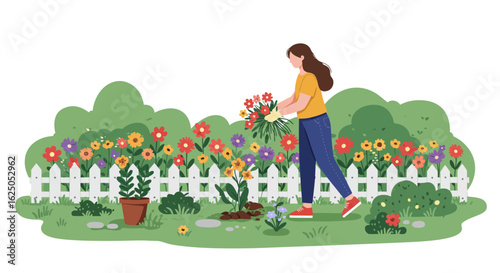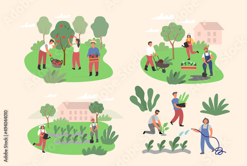 Люди, собирающие фрукты и ягоды, векторная плоская изолированная иллюстрация. Мужские и женские персонажи -садовники, фермеры, собирающие урожай яблок и груш в саду. Концепция садоводства, сбора фруктов.