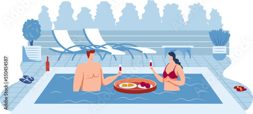 Люди катаются на водном скутере, плавают, ныряют с аквалангом, ныряют с маской и трубкой, плоская векторная иллюстрация. Подводное плавание. Занятия водными видами спорта на пляже. Летние каникулы.