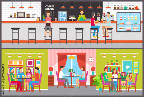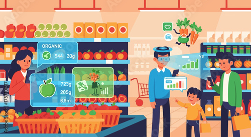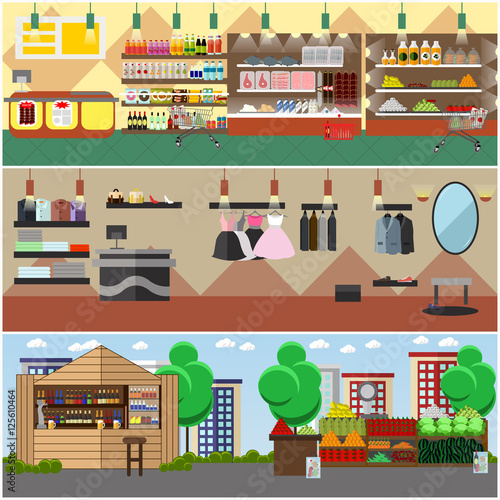 Люди, совершающие покупки в магазине, и концептуальные баннеры местного рынка. Красочная векторная иллюстрация. Покупатели покупают продукты в продовольственном супермаркете, примеряют одежду.
