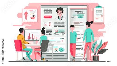 Люди делают покупки в концептуальных плакатах магазина. Красочная векторная иллюстрация. Покупатели покупают продукты в продовольственном супермаркете, примеряют одежду.