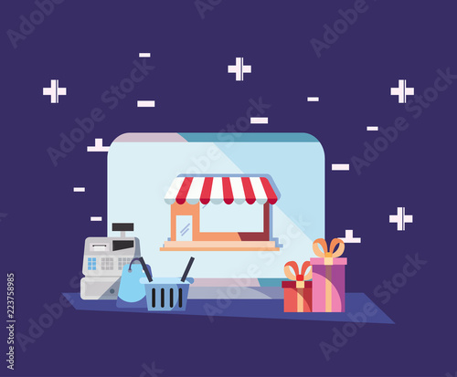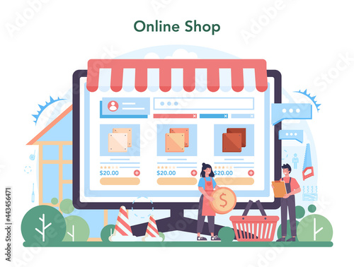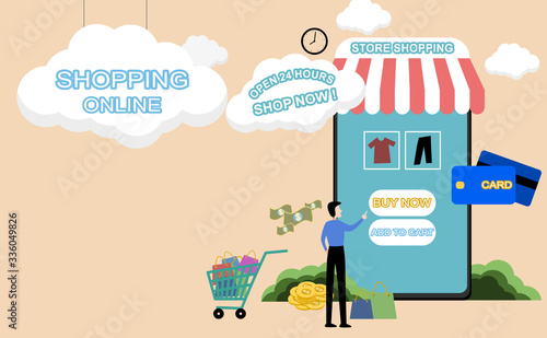 Люди делают покупки онлайн, плоская векторная иллюстрация. Интернет-магазин, электронная коммерция, цифровой маркетинг, служба онлайн-доставки, мобильная коммерция.
