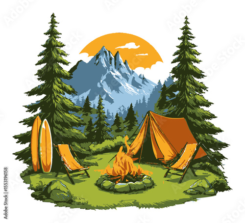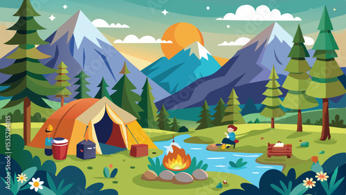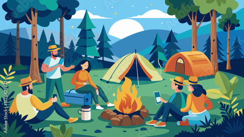 Люди сидят у костра и играют на гитаре. Группа друзей рядом с походной палаткой и наблюдает за звездной ночью. Векторный плакат с каникулами в летнем лагере. Горный и озерный пейзаж. Приключения, природа, костер.