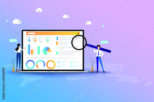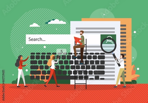 Крошечные люди, студенты, изучающие английский онлайн, плоская векторная иллюстрация. Онлайн-курсы иностранных языков. Дистанционное обучение, дистанционное обучение, электронное обучение.