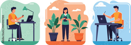 Люди путешествуют на самолете векторная иллюстрация. Мужчина и женщина ждут рейса в терминале аэропорта. Пассажиры пользуются ноутбуком и Интернетом на борту. Оператор туристической компании бронирует билет по телефону.