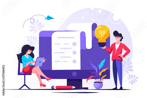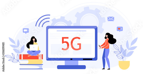 Огромный монитор компьютера, микро-мужские и женские персонажи, ищущие местоположение, читающие онлайн-новости, векторная иллюстрация. Люди, использующие гаджеты современной технологической концепции для веб-баннера, страницы веб-сайта и т.Д