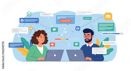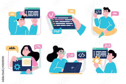 Люди, использующие различные онлайн-сервисы и приложения для учебы, работы и отдыха, создают векторную сцену. Разработка видеоконтента, программирование, образование, просмотр кино и чтение книг по интернет-иллюстрации