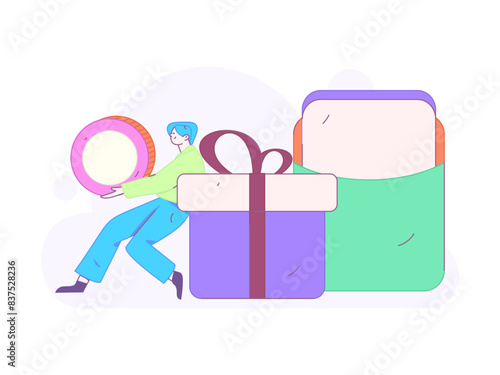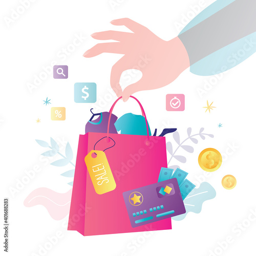 Люди, использующие экологически чистую многоразовую ткань, бумажные покупки, продуктовую сумку, кофейную чашку, плоскую векторную иллюстрацию. Ноль отходов. Жизнь без пластика. Экологичный образ жизни.