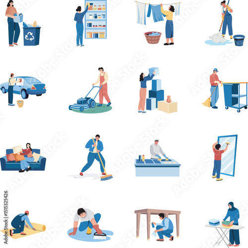 Мультяшные персонажи мужского и женского пола работают, занимаясь серфингом в сети с помощью портативных компьютеров дома, в офисе, кафе и в парке, векторная плоская иллюстрация, изолированная на белом фоне.