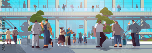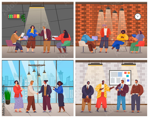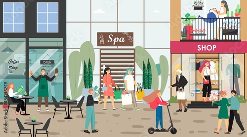 Люди, посещающие кафе, магазин одежды, идущие по торговой улице города, плоская векторная иллюстрация. Счастливые дамы покидают спа-салон. Хай-стрит, центр города, общественное место.