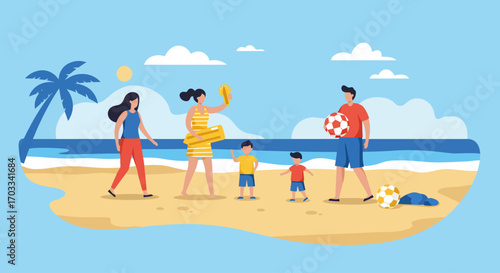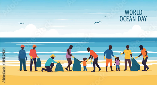Люди-волонтеры очищают пляж от отходов векторной иллюстрации. Команда взрослых и подростков вместе собирают мусор в пакеты и мусорное ведро. Концепция защиты окружающей среды, экология и сохранение природы