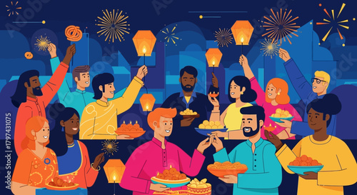 Люди смотрят фильм в кинотеатре и сидят на стульях в зрительном зале. Концептуальная векторная рисованная иллюстрация. Пара, семья с детьми, мужчина и женщины смотрят фильм и едят попкорн.