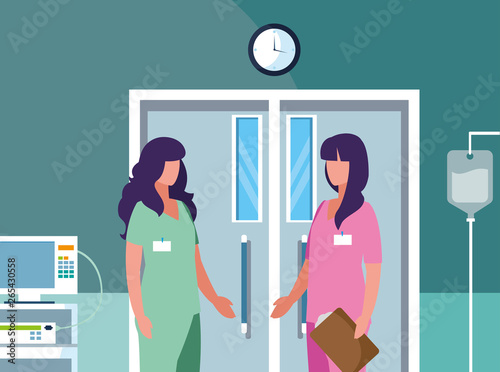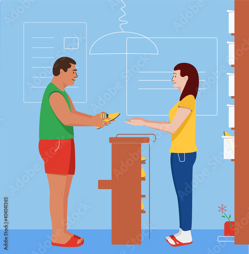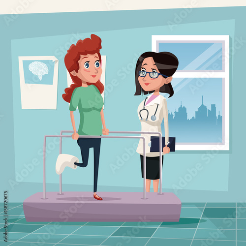 Векторная иллюстрация временно нетрудоспособных людей, посещающих врача. Мужчина со сломанной ногой, пользующийся костылями, и женщина со сломанной рукой в гипсе. Дизайн в плоском стиле.