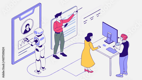 Люди с плакатами, флагами и мегафоном, плоская векторная изометрическая иллюстрация. Общественная деятельность, ненасильственная демонстрация, протест, митинг, пикетирование или сцена забастовки.