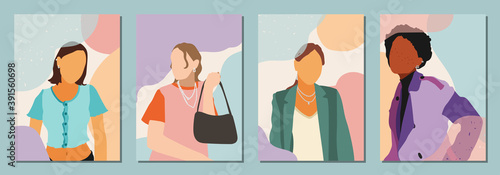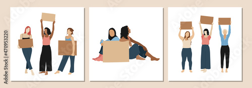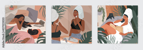 Люди с симптомами болезни дома и на улице, набор векторных плакатов. Сезон простуды и гриппа. Женщина в постели с простудой, лихорадкой, насморком, кашлем и принимающая лекарства. Толпа, зараженная Covid.