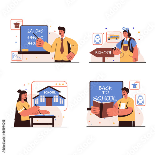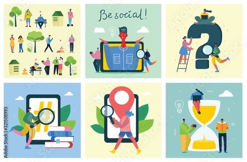 Люди с вредными привычками. Векторная плоская иллюстрация. Смартфон, шопинг, кофеин или кофейная мания и употребление нездоровой пищи. Набор поведенческих зависимостей. Негативное воздействие на психическое или физическое здоровье человека.