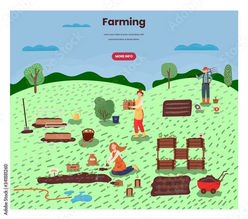 Люди работают на ферме, сажают овощи. Фермер, поле земледелия, урожай урожая. Иллюстрация концепции. Векторный шаблон дизайна веб-сайта. Иллюстрация сайта целевой страницы