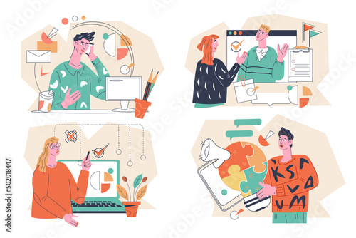 Набор векторных сцен несчастных сгоревших рабочих. Концепция выгорания людей от перегрузки и усталости. Усталые измученные перегруженные работой мужчина и женщина в состоянии стресса с большим количеством работы и иллюстрацией личных задач