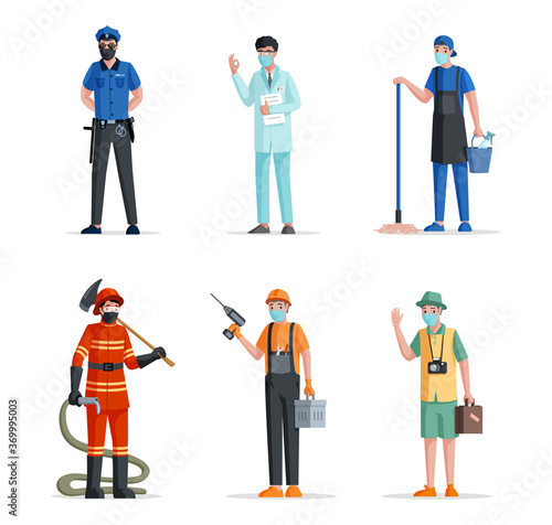 Люди, работающие на переднем крае пандемии вируса короны векторная плоская иллюстрация. Медицинские работники борются с вирусом не понаслышке. Доставка полиции персонал клининговых компаний, предоставляющий основные услуги