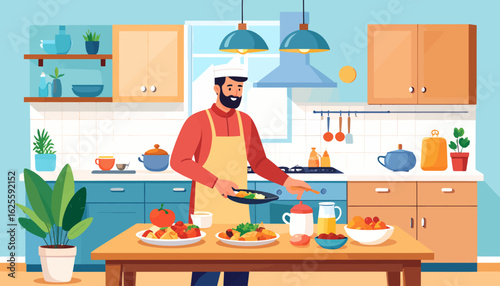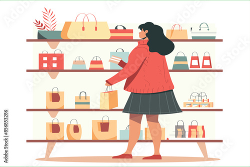 Парфюмерный магазин. Счастливая женщина, держащая флаконы духов, плоская векторная иллюстрация. Парфюмерия, интерьер универмага с полками, полными парфюмерных товаров.